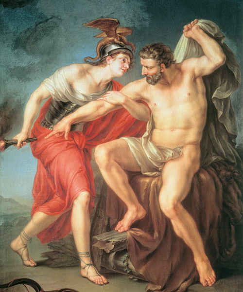 Согласно греческой мифологии, первым поколением богов были титаны – дети Урана-Неба и Геи-Земли (ее первоначальное имя было Тита, поэтому и всех рожденных ею назвали титанами). Второе поколение богов – олимпийцы, во главе с Зевсом – происходили уже от титанов, они победили их и захватили власть над миром. Один из титанов – Прометей – был сыном Иапета, двоюродного брата Зевса и богини Фемиды (второй супруги Зевса, богини права и законного порядка). Прометей более всего известен как покровитель людей, похитивший для них с Олимпа огонь и обучивший их земледелию, ремеслам и искусствам. За что и был наказан Зевсом. Прометея приковали к скале, а орел каждый день клевал его печень, пока – по разрешению Зевса – Геракл не освободил Прометея.