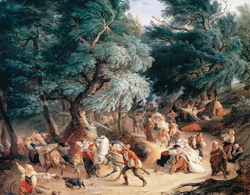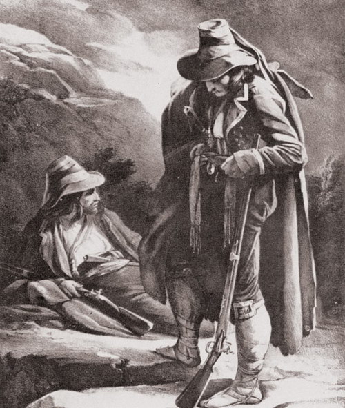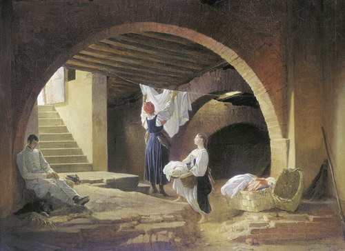 П. В. Басин. Итальянские разбойники. Картина написана в Италии, в XIX веке знаменитой своими разбойниками. Позже, в Петербурге, гравер Ерофеев перевел ее в литографию, и она пользовалась спросом у романтически настроенной публики