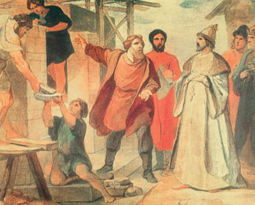 П. В. Басин. Василий II сооружает в Москве храм Богородицы, где отличаются Данила Черный и Андрей Рублев. Эскиз
