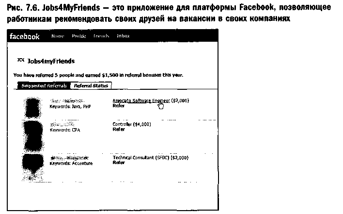 Стартап из Кремниевой долины Appirio привнес эту концепцию и в Facebook при помощи своего приложения Jobs4MyFriends. Это приложение позволяет компаниям обращаться к сетям своих работников в поиске кандидатов. С учетом высокой цены поиска персонала и практически универсальной тенденции, когда лучшие кандидаты приходят по рекомендации работников, многие работодатели предлагают некоторые бонусы за рекомендацию работниками успешных кандидатов.