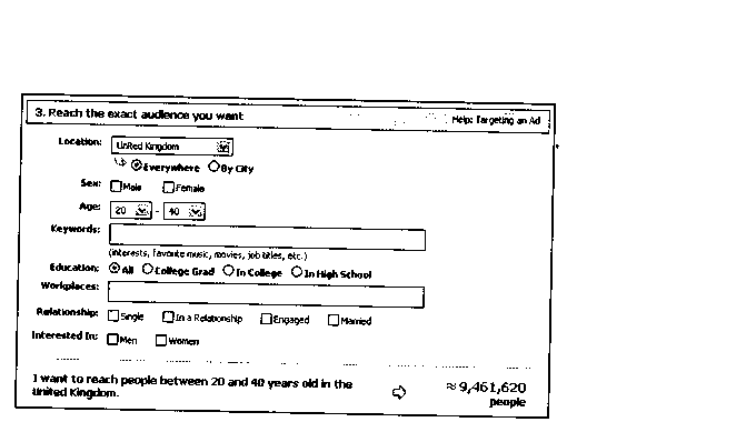 Рис. 9.5. Рекламодатели в Facebook могут гипертаргетировать свою рекламу на основании восьми параметров, видя при этом, сколько участников Facebook соответствуют заданным критериям