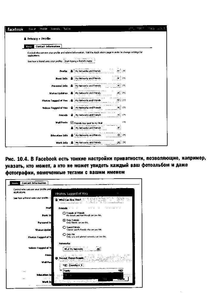 Параметры приватности в Facebook также позволяют вам контролировать, что могут увидеть те люди, которые вашими друзьями не являются. Вы можете выбрать варианты ограничения видимости — «Мои сети и друзья», «Друзья друзей» или «Только друзья» {рис. 10.4). Например, вы не хотите показывать свой профиль всем пользователям Facebook, но считаете вполне удобным, если его увидят ваши бывшие однокурсники или люди из других сетей. Настройки приватности важны для бизнес-профессионалов, заинтересованных в социальном нетворкинге. Стратегически подходя к тому, чтобы какой-то информацией поделиться, а какую-то информацию скрыть, люди могут показать себя с более привлекательной стороны и наладить эмоциональное взаимопонимание с коллегами, защищая при этом корпоративный имидж и репутацию.