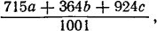 где a, b и c — остатки от деления задуманного числа на 7, 11 и 13. Задуманное число равно остатку от деления числителя формулы на знаменатель.