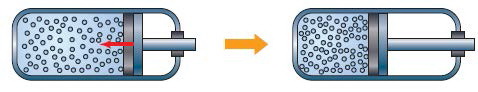 Теперь приложим к поршню с внешней стороны силу, т. е. начнём толкать его внутрь сосуда. Посмотрим, что произойдёт с заключённым в сосуде газом. Поршень будет перемещаться внутрь сосуда, уменьшая его объём и площадь его стенок. Так как число молекул в сосуде не изменилось, а поверхность стала меньше, то на каждый квадратный сантиметр этой поверхности будет приходиться больше ударов молекул. Следовательно, давление газа в сосуде будет возрастать. Но это ещё не всё. Молекулы, ударяющиеся в движущийся навстречу им поршень, будут отскакивать от него с большей скоростью, чем при ударе о неподвижный. Поэтому скорость молекул в сосуде будет увеличиваться, а, следовательно, температура в нём будет расти. Быстрые молекулы будут ударять в стенки сосуда с большей силой, а это будет служить дополнительной причиной возрастания давления.