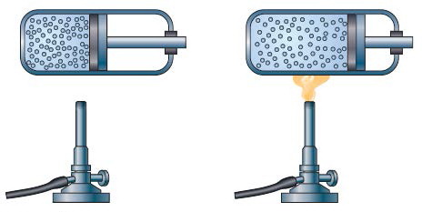 Изменение температуры и давления. Выясним, как связаны температура и давление в том случае, когда объём газа остаётся неизменным. Для этого надо закрепить поршень так, чтобы он не мог двигаться, и нагреть сосуд с газом. Поверхность сосуда, а следовательно, и частота ударов молекул о неё меняться не будут, но сила ударов возрастёт из-за увеличения кинетической энергии молекул. В этом случае давление будет увеличиваться пропорционально увеличению температуры, как и утверждает закон Шарля.