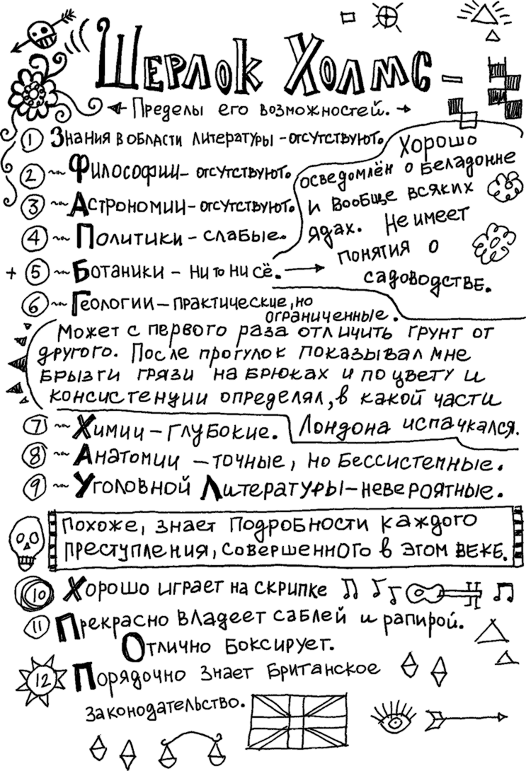Я хотел было спросить, что же это за работа, но что-то подсказало мне, что вопрос этот не вполне тактичен. Впрочем, я тщательно обдумал наш короткий разговор и попытался сделать некоторые выводы. Холмс сам сказал, что не обременяет себя бесполезными знаниями. Соответственно, все его познания связаны с его деятельностью. Я мысленно перечислил все отрасли науки, в которых, по моим наблюдениям, он был прекрасно осведомлен. Я даже взял карандаш и набросал свои выводы на бумаге. Когда документ был готов, я не смог удержаться от улыбки. Получилось вот что: