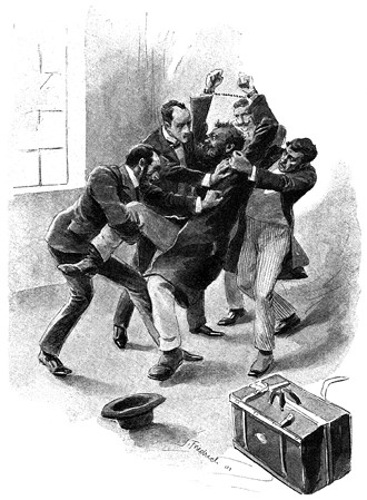 Дальнейшее разыгралось молниеносно – я даже не понял, что происходит. Мне живо вспоминаются торжество в чертах Холмса, звонкие ноты его голоса и злобное недоумение, с каким кэбмен рассматривал сверкающие наручники, словно бы по волшебству сомкнувшиеся на его запястьях. На краткий миг все застыли, как скульптурная группа. Затем с бессвязным яростным ревом пленник высвободился из рук Холмса и метнулся к окну. Он разбил раму и стекло, но выпрыгнуть не успел: Грегсон, Лестрейд и Холмс бросились