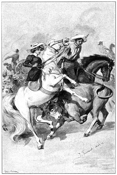 У окраины города Люси обнаружила, что дорогу перекрыло большое воловье стадо, которое гнали полдюжины пастухов – по виду настоящих дикарей. В нетерпении она направила лошадь в просвет, но стадо немедля сомкнулось, и Люси очутилась в потоке длиннорогих волов с налитыми кровью глазами. Обращаться со скотиной было делом привычным, поэтому Люси не испугалась, а принялась лавировать, чтобы побыстрей выбраться наружу. К несчастью, одно из животных, случайно или умышленно, задело рогом бок мустанга, и лошадь пришла в бешенство. С хрипом ярости она поднялась на дыбы и заметалась; чтобы справиться с ней, потребовалось бы все искусство опытного наездника. Это грозило бедой. При каждом прыжке лошадь снова натыкалась на рога и оттого еще больше бесилась. Девушка могла лишь держаться в седле: малейшая оплошность означала бы страшную смерть под копытами неповоротливых испуганных животных. К таким переделкам Люси не привыкла, голова у нее закружилась, руки, державшие поводья, ослабели. Задыхаясь в облаке пыли и пара от разгоряченных волов, она едва не сдалась, но кто-то поблизости заверил ее ласковым голосом, что все будет хорошо. Тут же чья-то жилистая смуглая рука схватила испуганную лошадь под уздцы и провела сквозь стадо на обочину.