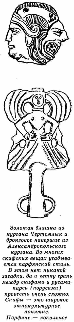 Кто же такие были парфяне, основатели одной из самых могущественных держав античной эпохи, просуществовавшей целых 500 лет, державы, остановившей натиск Рима на восток? Как всегда, когда дело касается Великой Скифии, историография хранит молчание. Но парфяне были вовсе не каким-то «малым народом» без корней. Иранский правящий слой, именовавшийся «парфянами», был образован простыми скифами, или, по-ирански, «саками», такими же, как их собратья с Арала и Каспия, Волги и Дона. (Этноним «парфяне» и топоним «Парфия»-Парсия, как и «Персия» (парси, фарси), исходят из русского Порусия — одного из самых распространенных топонимов, оставленных суперэтносом русов по всей Евразии. Но в империи жили и иные этносы. — Примеч.