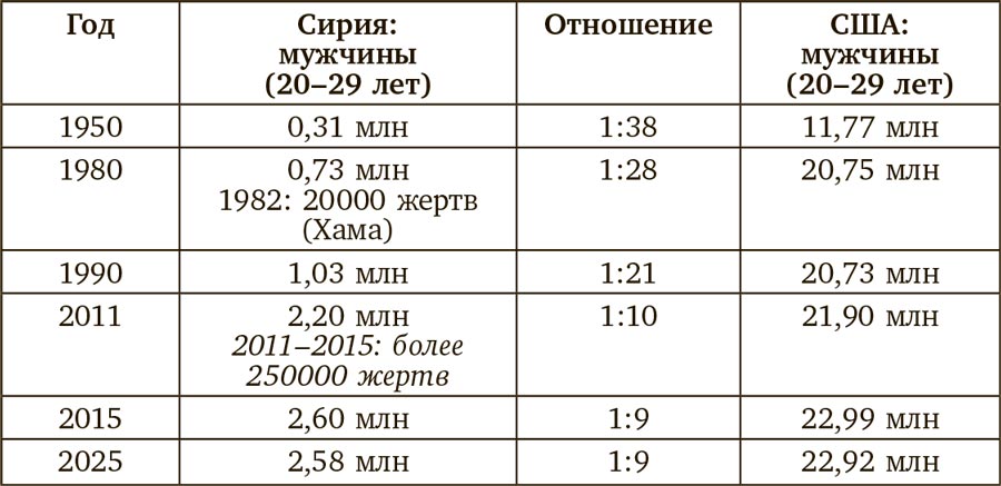 В ходе войны в Сирии (2011–2016) мы также столкнулись с невниманием к демографическим особенностям. В то же время руководители Америки и России понимают, что напрасно рискуют жизнями своих граждан. Ведь сколько раз можно посылать единственного сына в семье, единственного сына своей матери, в бой, чтобы сдерживать десяток третьих или четвертых братьев от того, чтобы они не уничтожали друг друга или не заставляли своих сестер надевать хиджаб?