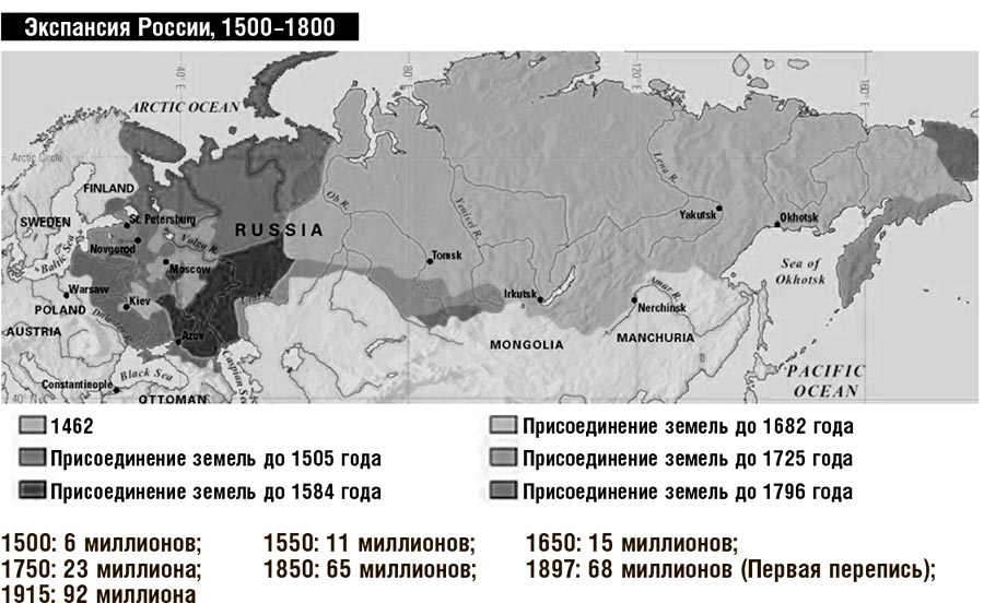 Рис. 3. Географическая экспансия и демографические взрывы в России с 1482 по 1796 год (приблизительные показатели) [5]