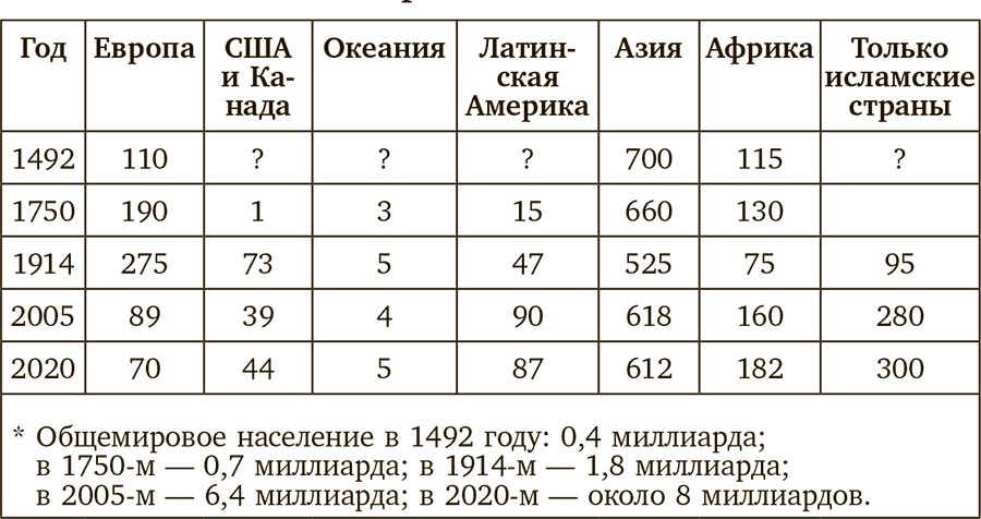 Если в 1500 году из 1000 годных к военной службе мужчин (в возрасте от 15 до 29 лет) со всего мира около 100 приходилось на европейцев, в 1916 году, вместе с Северной Америкой, Австралией, Новой Зеландией и русской Азией, этот показатель составлял почти 350 «белых» мужчин.