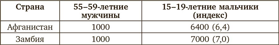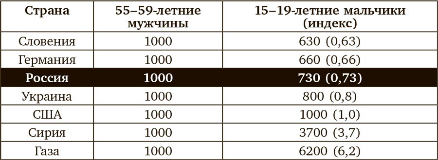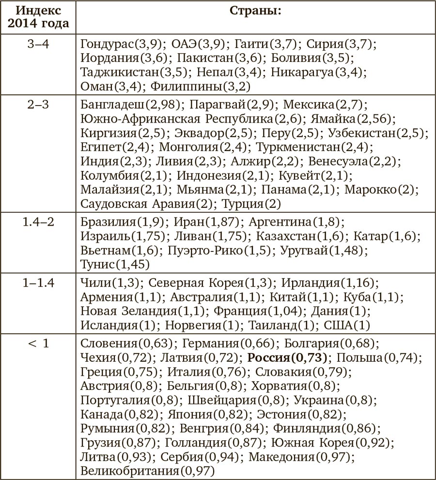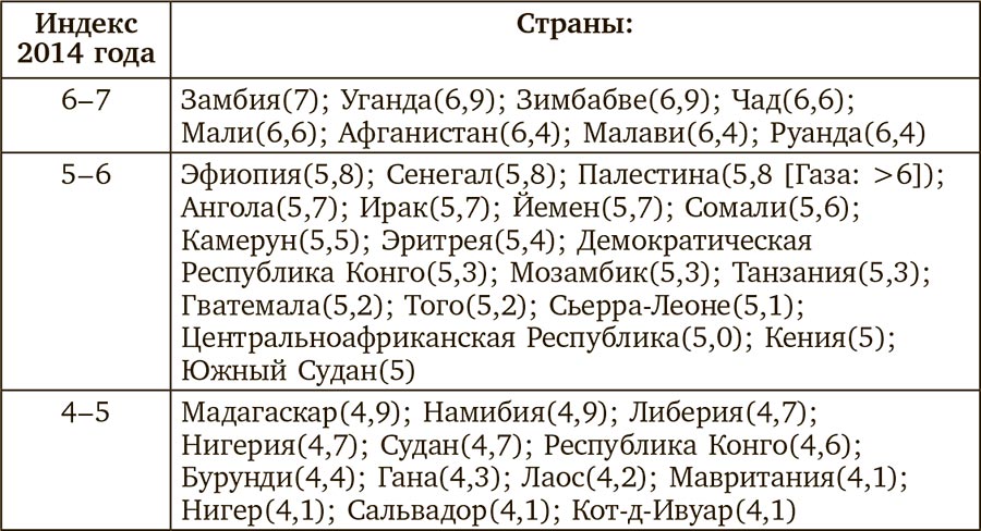 Страны, которые переживают молодежный сбой более 60 лет подряд, то есть страны, четыре поколения женщин которых впервые рожают детей в возрасте 15 лет, переходят в состояние демографической модернизации. В результате такой модернизации на 100 мужчин в возрасте от 55 до 59 лет, которые уходят на покой или умирают и освобождают соответственно по одному месту в социуме, приходится не менее 3000 молодых людей мужского пола в возрасте от 15 до 19 лет. Они вступают в борьбу за место под солнцем и начинают конкурировать за ограниченное число рабочих и статусных мест. В итоге трое молодых парней должны делить между собой одно кресло, верстак или плуг. Ниже приведена таблица, показывающая военный индекс различных стран. Те государства, которые переживают молодежный сбой, имеют индекс более трех пунктов. А в ситуации, когда на 1000 мужчин в возрасте от 55 до 59 лет приходится только 900 или меньше молодых людей от 15 до 19 лет, военный индекс составляет менее одного пункта; в этом случае в стране имеет место демографическая капитуляция. Имея военный индекс 0,73 пункта, Россия относится к последней группе, но все-таки обгоняет еще пять государств. Говоря о демографическом нейтралитете, мы подразумеваем соотношение 1000 молодых мужчин на 1000 пожилых, причем показатели вплоть до 1400 претендентов на 1000 мест также можно отчасти отнести к нейтральным (военный индекс от 1 до 1,4 пункта). На основании такого подразделения и более-менее надежных демографических данных можно составить следующую таблицу.