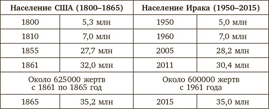 Пока страны Европы не начнут корректно и полноценно анализировать свой демографический спад, для них останется загадкой милитаристский настрой стран третьего мира. А ведь, начиная со второй половины XX века, их конфликты сравнялись, а то и обогнали по потерям европейские баталии периода мирового господства Запада до 1945 года. При этом именно демографические и исторические сравнения позволяют провести очень важные параллели. Например, между США XIX века за 65 лет до конца гражданской войны и Ираком за последние 65 лет XX–XXI веков.