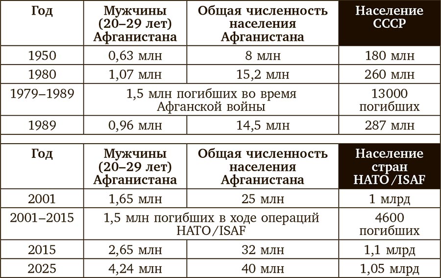 Демографический потенциал Афганистана не был понят ни в Советском Союзе (1978–1989), ни позже, с 2001 года и по сей день, в НАТО. Эта страна может себе позволить потерять каждых двух сыновей на семью и на поколение вообще и все равно продолжать бой. Именно поэтому в то время, когда конфликт с Советским Союзом прекратился, а с НАТО еще не начался, и позже – после вывода миротворческого контингента в 2015 году – население Афганистана истребляет себя самостоятельно в ходе гражданских войн.