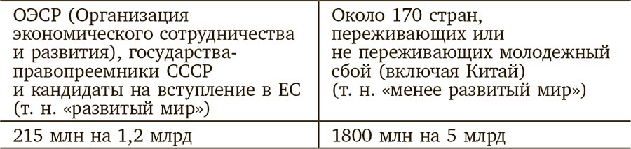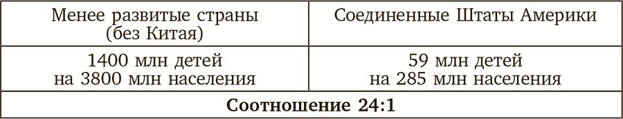 В государствах, которые не входят в список из 30 стран-членов ОЭСР (плюс Россия, Украина, Белоруссия и кандидаты на вступление в ЕС), растет более 900 миллионов мальчиков в возрасте до 15 лет. Нужно помнить, что США – ведущий член ОЭСР. В американских семьях за это же время вырастет только 30 миллионов сыновей в возрасте до 15 лет. При этом у 20 % из них будет избыточный вес, а общий показатель страдающих от ожирения жителей США составляет 61 %. Остальные члены ОЭСР (включая восточнославянские государства и кандидатов на вступление в ЕС) располагают 70 миллионами сыновей младше 15 лет. Даже если их каким-то фантастическим образом объединить, то все равно получится соотношение 9:1 по сравнению с остальным миром. Развитый мир составляет только одну пятую часть от общего населения Земли, и при таком малом приросте населения он может превратиться в одну десятую всего за несколько лет. А если убрать из расчетов Китай, то развивающиеся страны улучшат свой показатель с 1/9 до 1/7 от общего показателя.