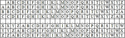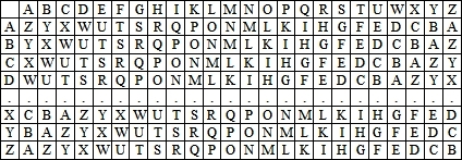 Сообщение шифровалось буква за буквой, для чего в таблице нужно было найти столбец, обозначенный той же буквой, что и соответствующая буква ключа, и строка, обозначенная той же буквой, что и буква
