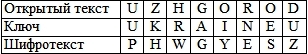 Например, если в качестве ключа использовать слово «UKRAINE», то шифрование слова «UZHGOROD» приведет к шифровке «PHWGYESZ» (см. таблицу).