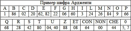 Такие смешанные алфавиты часто использовались в качестве алфавита шифротекста в шифрах простой замены. С целью усложнения шифра простой замены Ардженти рекомендовал не разделять слова, использовать «омофонные» замены, вставлять в шифротекст большое количество «пустышек» (0), устранять пунктуацию, не вставлять в шифротекст открытые слова («клер») и т.д. Для букв, которые часто встречались в словах, он ввёл несколько обозначений, а для соединений букв, которые часто встречались в текстах, – отдельные обозначения. Позже подобные идеи получили широкое распространение.
