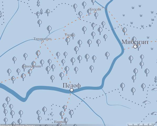 Были в этом регионе и другие города. Халсин, Улсин, Галахалмин и Тиранбезит. Все они, как и Пелоф, находились по правому берегу Гарлоры, что впадает в западное море. Но только через Мибензит и Пелоф шел торговый маршрут на восток и юг, а эти четыре городка больше были похожи на крупные села, чем на полноценные города. В совокупности их население составляет хорошо, если половину от того числа, что проживает сейчас внутри стен Мибензита, да и расположение их не дает никаких стратегических преимуществ. Обычные провинциальные городки, которые живут за счет ремесел и местной торговли, в основном друг с другом, живут тихо и спокойно, даже по меркам Западных Земель.