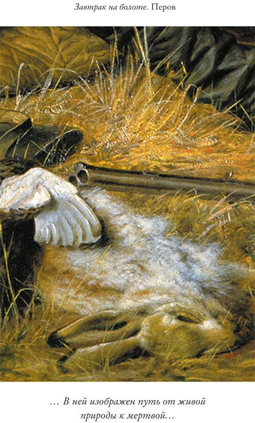 Значительность охотничьего мотива намекает на подлинную драму перовского полотна. Она, если присмотреться к этому таинственному холсту, вовсе не сводится к водевилю, каким поколения учителей тешили школьников. Перов срифмовал свою картину с тремя видами живописи, которые друг с другом не сливаются, а стыкуются, причем так, что видны швы. Задник отдан пейзажу – дикому, неочеловеченному, безнадежно холодному и неприютному. Это – зона доисторической природы, еще не тронутой нашей рукой. Здесь водятся птицы, но могли бы и птеродактили. В центре картина переходит в жанр, то есть, как тогда его определяли, в “сцену из текущей жизни”.