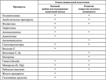 В табл. 55 представлены схема, группы препаратов, которые могут быть использованы при наработке силовых качеств.