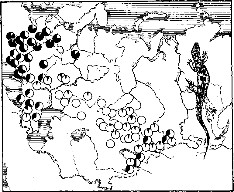 Примером подобной работы может служить исследование по распределению фена меланизма у хомяков на Украине, выполненное в конце 30-х годов известным советским генетиком С. М. Гершензоном. Ученому удалось выяснить, что распространение меланизма связано с повышенной влажностью местообитаний. Однако чаще, чем факт простого присутствия или отсутствия данного фена в том или ином участке ареала, в исследованиях анализируется распространенность этого фена. Выше упоминался широко известный в мировой литературе случай распространения мутации (фена) simplex в строении зубов обыкновенной полевки в Средней Европе. Из зоны с повышенной концентрацией этого фена в Ютландии во все стороны происходит как бы растекание признаков с постепенно понижающейся концентрацией этого фена. На рис. 19 показано распределение в пределах ареала прыткой ящерицы фена прерывистой полосы по центру спины. Видно, что зоны повышенной концентрации фена довольно четко отделены от зон пониженной концентрации. Проявляются как будто определенные границы его пониженной или повышенной концентрации. На аналогичных картах, составляемых для прыткой ящерицы по другим фенам, есть очень интересные границы: для одних фенов р. Волга, например, является непреодолимой преградой; другие фены в высокой концентрации встречаются на ее западном берегу и в очень низкой концентрации — на восточном. Для некоторых же фенов как будто и не существует такой преграды, как Волга.