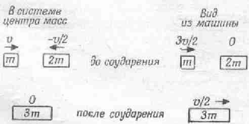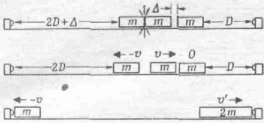 Фиг. 10.7. Неупругое соударение между телами с массами m и 2m.