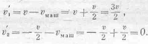 Перейдем теперь к следующему вопросу. Что произойдет, если тело с массой m и скоростью v столкнется с покоящимся телом с массой 2m? Воспользовавшись принципом относительности Галилея, можно легко ответить на этот вопрос. Попросту говоря, нам нужно опять садиться в машину, идущую со скоростью–v/2 (фиг. 10.7), и наблюдать за только что описанным процессом.