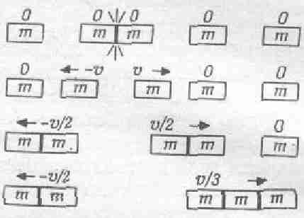 После соударения масса 3m покажется нам движущейся со скоростью v/2. Таким образом, мы получили, что отношение скоростей до и после соударения равно 3:1, т. е. образовавшееся тело с массой 3m будет двигаться в три раза медленней; И в этом случае снова выполняется общее правило: сумма произведений массы на скорость остается той же как до, так и после соударения: то + 0 равно 3m•v/3. Вы видите, как постепенно шаг за шагом устанавливается закон сохранения импульса.