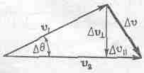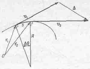 Другую, поперечную составляющую ускорения легко вычислить, взглянув на фиг. 11.7 и 11.8. За короткое время ?t изменение угла между v1 и v2 равно малому углу ??. Если величина скорости равна v, то