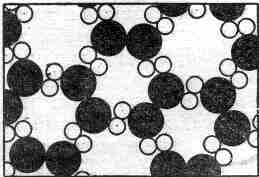 Итак, над поверхностью воды находится воздух – газ, содержащий некоторое количество водяного пара. Что происходит на этом рисунке? Молекулы воды все время движутся. Время от времени какая–нибудь из молекул близ поверхности получает толчок сильнее остальных и выскакивает вверх. На рисунке этого, конечно, не видно, потому что здесь все неподвижно. Но попробуйте просто представить себе, как одна из молекул только что испытала удар и взлетает вверх, а с другой случилось то же самое и т. д. Так, молекула за молекулой вода исчезает – она испаряется. Если закрыть сосуд, мы обнаружим среди молекул находящегося в нем воздуха множество молекул воды. То и дело некоторые из них снова попадают в воду и остаются там. То, что казалось нам мертвым и неинтересным (скажем, прикрытый чем–нибудь стакан воды, который, может быть, 20 лет простоял на своем месте), на самом деле таит в себе сложный и интересный, беспрерывно идущий динамический процесс. Для нашего грубого глаза в нем ничего не происходит, но стань мы в миллиард раз зорче, мы бы увидали, как все меняется: одни молекулы взлетают, другие оседают.
