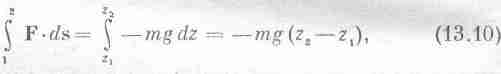 Что это значит? Это значит, что, как бы и по какой бы кривой траектории ни двигалось тело под действием силы, все равно изменение в к. э. при переходе от одной точки кривой к другой равно интегралу от компоненты силы вдоль кривой, умноженной на дифференциал смещения ds (интегрирование от первой точки до второй). И у этого интеграла есть имя: его называют работой, совершенной силой над телом. Немедленно мы обнаруживаем, что мощность – это работа за секунду. И еще мы замечаем, что работу производит только составляющая силы вдоль направления движения. В нашем первом простом примере участвовали только вертикальные силы с одной–единственной составляющей Fz, равной –mg. В этих обстоятельствах совершенно неважно, как тело движется, прямо вниз или по параболе, все равно от F•ds (которое можно написать как Fxdx+Fydy+Fzdz) остается только F^dz = -mgdz, потому что прочие составляющие силы – нули. Значит, в этом случае