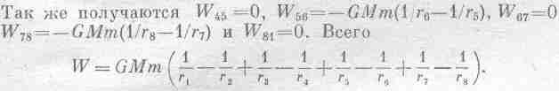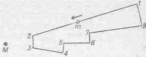 Мы должны доказать следующее предположение: раз трения нет, тело должно вернуться ни с меньшей, ни с большей скоростью, а как раз с такой, чтобы еще и еще делать круги по этому замкнутому пути. Или, другими словами, вся работа, произведенная в движении по замкнутому пути, должна быть нулем для сил тяжести, потому что если бы она не была нулем, то можно было бы получить энергию за счет такого движения тела. (Если бы работа оказалась меньше нуля, так что скорость в конце обхода уменьшилась бы, то для получения энергии стоило бы только повернуть обратно; силы ведь зависят не от направления движения, а только от положения. Если в одном направлении работа получится с плюсом, то в обратном она будет с минусом; любая ненулевая работа означает создание вечного двигателя.) Так что же, действительно ли работа равна нулю? Попробуем показать, что да. Сперва мы лишь на пальцах поясним, почему это так, а уж потом оформим математически. Положим, мы выдумали траекторию, показанную на фиг. 13.3; масса падает от 1 к 2, поворачивает до 3, обратно поднимается к 4, затем через 5, 6, 7, 8 движется обратно к 1. Все линии идут либо по радиусу, либо по кругу с центром М. Какая работа совершается на таком пути? Между 1 и 2 она равна произведению GMm на разность 1/r в этих точках: