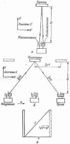 а, — «световые часы» покоятся в системе S '; б—те же часы движутся через систему S; в — диагональ, по которой движется пучок света в движущихся «световых часах».