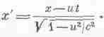 чтобы времена были равны. Чтобы получился такой результат, приходится допустить, что продольное плечо BE кажется сжатым в отношении Ц(1-и2/с2). Что означает это сокращение на языке Джо и Мика? Положим, что Мик, двигаясь с системой S' в направлении х', измеряет метровой линейкой координату х' в некоторой точке. Он прикладывает линейку х' раз и думает, что расстояние равно х' метрам. С точки же зрения Джо, (в системе S) линейка у Мика в руках укорочена, а «на самом деле» отмеренное им расстояние равно x'Ц(1-u2/с2) метров. Поэтому если система S' удалилась от системы S на расстояние ut, то наблюдатель в системе S должен сказать, что эта точка (в его координатах) удалена от начала на x=x'Ц(1-u2/c2)+ut, или