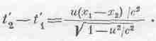 Пусть человек, движущийся в космическом корабле (система S'), установил в двух концах корабля часы. Он хочет знать, одинаково ли они идут. Как синхронизовать ход часов? Это можно сделать по-разному. Вот один из способов, он почти не требует вычислений. Расположимся как раз где-то посредине между часами. Из этой точки пошлем в обе стороны световые сигналы. Они будут двигаться в обоих направлениях с одинаковой скоростью и достигнут обоих часов в одно и то же время. Вот этот-то одновременный приход сигналов и можно применить для согласования хода. Положим, что человек в S' таким способом согласует ход часов. Посмотрим, согласится ли наблюдатель в системе S, что эти часы идут одинаково. Космонавт в системе S' имеет право верить, что их ход одинаков; ведь он не знает, что он движется. Но наблюдатель в системе S сразу рассудит, что раз корабль движется, то часы на носу корабля удалились от светового сигнала и свету пришлось пройти больше половины длины корабля, прежде чем он достиг часов; часы на корме, наоборот, двигались к световому сигналу — значит, его путь сократился. Поэтому сигнал сперва дошел до часов на корме, хотя космонавту в системе S' показалось, что сигналы достигли обоих часов одновременно. Итак, выходит, что когда космонавт считает, что события в двух местах корабля произошли одновременно (при одном и том же значении t'в его системе координат), то в другой системе координат одинаковым t' отвечают разные значения t!