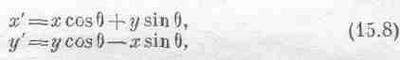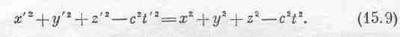 В этом уравнении три первых члена в каждой стороне представляют собой в трехмерной геометрии квадрат расстояния между точкой и началом координат (сферу). Он не меняется (остается инвариантным), несмотря на вращение осей координат. Аналогично, уравнение (15.9) свидетельствует о том, что существует определенная комбинация координат и времени, которая остается инвариантной при преобразовании Лоренца, Значит, имеется полная аналогия с вращением; аналогия эта такого рода, что векторы, т. е. величины, составленные из «компонент», преобразуемых так же, как и координаты, оказываются полезными и в теории относительности.