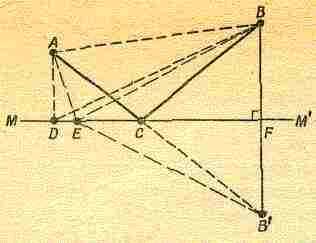 Попытаемся решить следующую задачу. На фиг. 26.3 изображены две точки А и В и плоское зеркало ММ'. Каким путем можно за кратчайшее время попасть из точки А в точку В? Ответ: по прямой, проведенной из А в В!