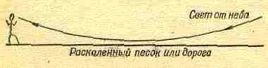 Другими словами, свет быстрее проходит в теплых слоях, чем в холодных. Поэтому свет проходит не по прямой, а идет по траектории с наименьшим временем, заворачивая для этого в теплые слои воздуха, чтобы сократить время. Таким образом, свет идет по кривой.