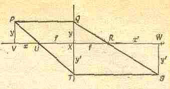 С помощью только этих фактов мы докажем формулу (27.12) геометрическим путем. Пусть объект находится на расстоянии x от фокуса и его высота есть у. Мы знаем, что луч PQ отклоняется и пройдет через фокус R по другую сторону линзы. Если свет от точки Р фокусируется линзой, достаточно определить путь еще одного луча, и тогда фокус будет расположен в точке пересечения двух лучей. Нужно только умело выбрать направление второго луча. Вспомним, что параллельный луч проходит через фокус, и наоборот: луч, проходящий через фокус, выходит параллельно оси! Поэтому проведем луч РТ через U. (Правда, фокусируемые лучи могут быть гораздо тоньше, чем начерченные нами, но их труднее изобразить, поэтому оставим нашу прежнюю схему.) Поскольку луч параллелен оси, проведем TS параллельно XW. Пересечение S и есть искомая точка. Отсюда мы получаем нужную высоту и правильное расстояние. Обозначим высоту через y', а расстояние до фокуса через x'. Теперь можно вывести формулу для линзы. Из подобных