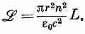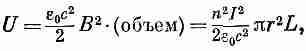 Если нам известно магнитное поле В одной катушки, мы можем найти коэффициент самоиндукции, приравнивая выражение для энергии (17.48) и 1/2жI2. Посмотрим, что получится в результате для индуктивности длинного соленоида. Раньше мы видели, что магнитное поле в соленоиде однородно и В снаружи равно нулю. Величина поля внутри равна В=nI/e0с2, где n — число витков на единицу длины намотки, а I — ток. Если радиус катушки r, а длина ее L (мы считаем, что L очень велика, чтобы можно было пренебречь краевыми эффектами, т. е. L >>r), то внутренний объем равен pr2L. Следовательно, магнитная энергия равна