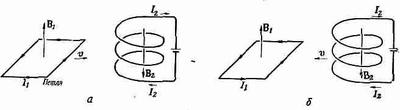Но представим себе полную систему, наподобие изображенной на фиг. 15.3,а, где петля с током I вдвигается в магнитное поле B1 созданное током I2 в катушке. ТокI1, текущий по петле, тоже будет создавать какое-то магнитное поле В2 близ катушки. Если петля движется, то поле В2 изменяется. В следующей главе мы увидим, что изменяющееся магнитное поле создает поле Е, и это поле действительно начнет действовать на заряды в катушке. Эту энергию мы обязаны включить в наш сводный баланс энергий.