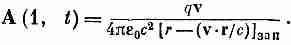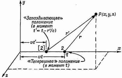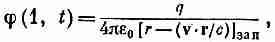 где r — вектор, соединяющий заряд с той точкой (1), в которой вычисляется потенциал j, а все величины в скобках надо вычислять в «запаздывающий» момент времени t'=(t—r'/c).