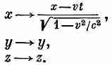 Пусть имеется заряд, движущийся вдоль оси х со скоростью v (фиг. 21.8). Нас интересуют потенциалы в точке Р(х, у, z). Если (=0 — момент, в который заряд проходит через начало координат, то в момент t заряд окажется в точке x—vt, y=z=0. А нам нужно знать его положение с учетом запаздывания, т. е. положение