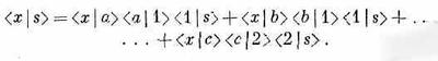 Тут изображены две стенки: одна с двумя щелями 1 и 2, другая с тремя — а, b и с. За второй стенкой в точке х стоит детектор, и мы хотим узнать амплитуду того, что частица достигнет х. Один способ решения состоит в расчете суперпозиции, или интерференции, волн, проходящих сквозь щели; но можно сделать и иначе, сказав, что имеется шесть возможных путей, и накладывая друг на друга их амплитуды. Электрон может пройти через щель 1, затем через щель а и потом в х, или же он мог бы пройти сквозь щель 1, затем сквозь щель b и затем в x; и т. д. Согласно нашему второму принципу, амплитуды взаимоисключающих путей складываются, так что мы должны записать амплитуду перехода от s к х в виде суммы шести отдельных амплитуд. С другой стороны, согласно третьему принципу, каждую из них можно записать в виде произведения трех амплитуд. Например, одна из них — это амплитуда перехода от s к 1, умноженная на амплитуду перехода от 1 к а и на амплитуду перехода от а к я. Используя наше сокращенное обозначение, полную амплитуду перехода от s к х можно записать в виде