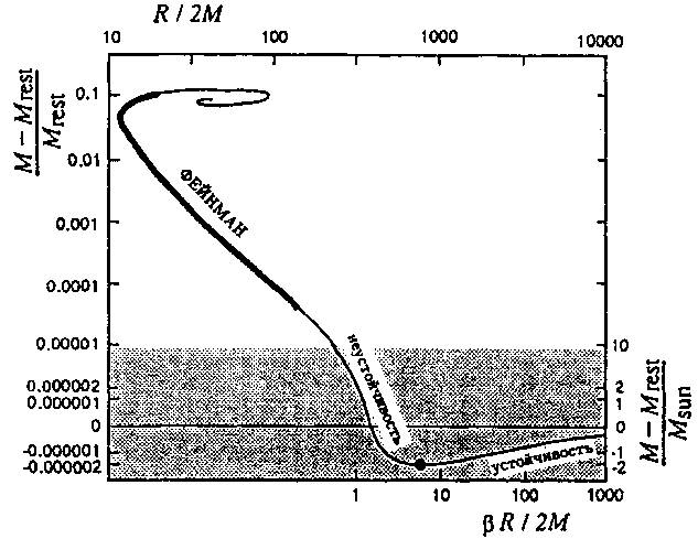 При обсуждении моделей Фейнмана и его (неверной) интерпретации их, полезно было бы использовать рисунок П.1. Этот рисунок показывает некоторые признаки семейства моделей сверхзвёзд, которые построил Фейнман (толстая кривая), совместно с их продолжением на ультрарелятивистский режим (верхняя тонкая линия) и их продолжением на почти ньютоновский режим (нижняя тонкая линия) - эти продолжения были вычислены позднее Ибеном [Iben 63], Фаулером [Fowl 64], Бардиным [Bard 65] и Тупером [Тоор 66]. По вертикальной оси откладывается гравитационная энергия связи звезды со знаком ”минус”; по горизонтальной оси откладывается радиус звезды. В практически ньютоновском режиме (затенённая область кривой связи энергии), который Фейнман не исследует, нельзя пренебрегать величинами pгаз и газ, энергия связи задаётся (как показал Фаулер [Fowl 64], как отклик на "гром среди ясного неба” Фейнмана) следующим тонким балансом между газовым давлением (первым членом) и эффектами общей теории относительности (второй член):