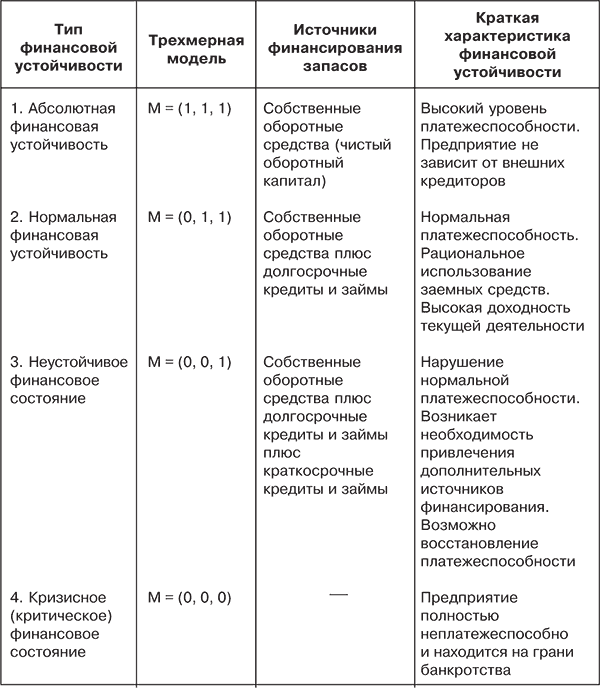 Данная модель характеризует тип финансовой устойчивости предприятия. На практике встречаются четыре типа финансовой устойчивости (табл. 4.1).