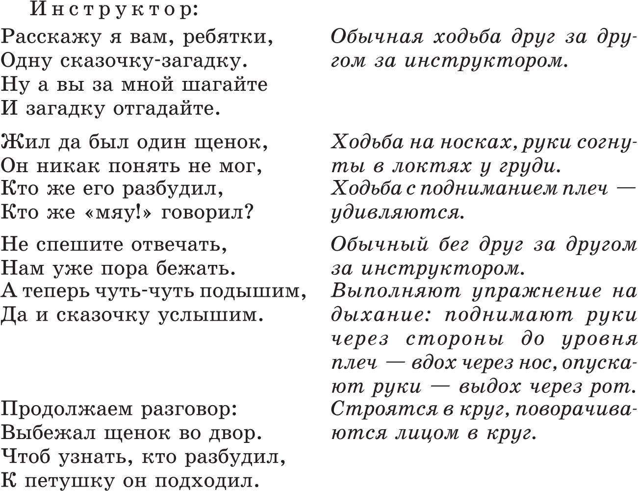 Ходит конь по бережку,Вороной по зеленому.Он головушкой помахивает,Черной гривушкой потряхивает,Золотой уздой позвякивает,Все колечушки-то бряк-бряк-бряк.Золотые,Инструктор: А теперь к нам в гости котик по мостику шагает, хвостик высоко держит, голову не опускает.
