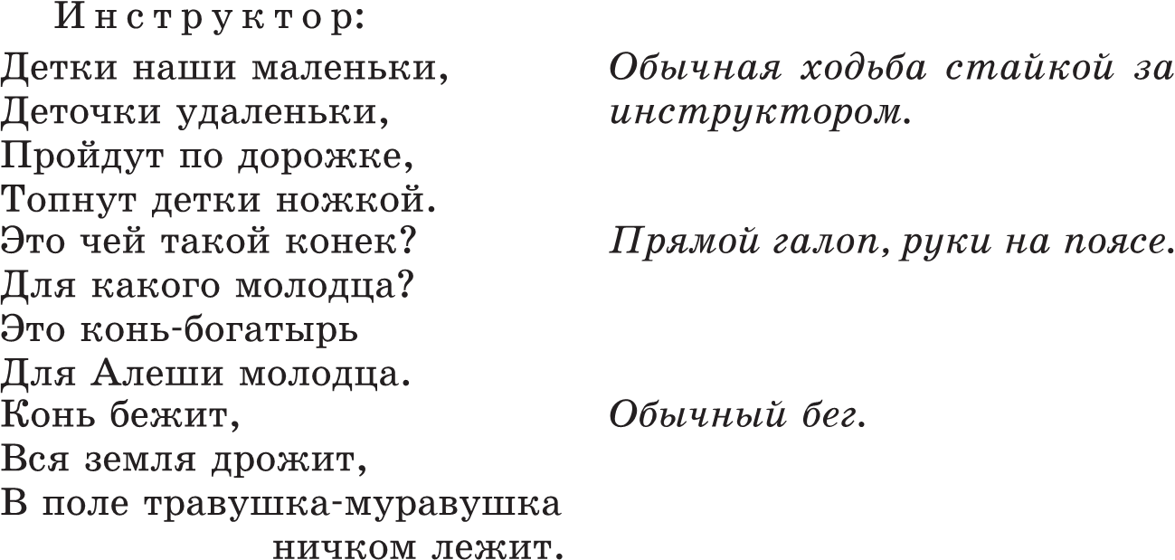 Инструктор: Прислушайтесь, ребята: кто-то копытцами постукивает. Да это конь вороной. Посмотрите, как он шагает, высоко колени поднимает, спину ровно держит да голову не опускает (показывает). Давайте и вы пошагайте, как вороной конь.